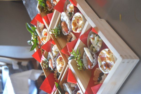 ほたてのマヨネーズ炒め/グラス仕立ての重ねずし/青汁と黒豆のケーキ/トマトとマンゴーのゼリー/ビスケットトリュフ
