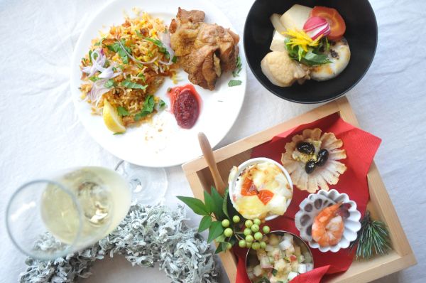 /大根とりんごのゆず香るカチュンバル/自家製最中 黒豆とマスカルポーネ/海老とれんこんの白煮/マカロニグラタン/ローストチキン ガラムマサラの香り ビーツケチャップ添え/チキンビリヤニ/米粉のハミングバードケーキ