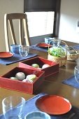 /黒豆クリームチーズのサンドイッチ/干し柿なます/飾りかまぼこ2種/トマトとビーツのムーズ/佐原風雑煮/鶏肉のチョコレート煮込み メキシカンライス添え/米粉のスパイスクグロフ ホワイトチョコレートがけ
