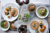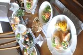 せりとクレソンのごま酢和え/春野菜を添えた信田巻き/ぎょうざ皮のキッシュ/いちごジャムポーク