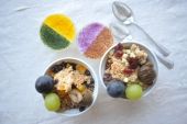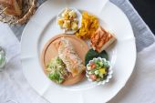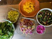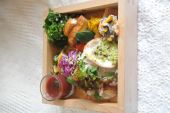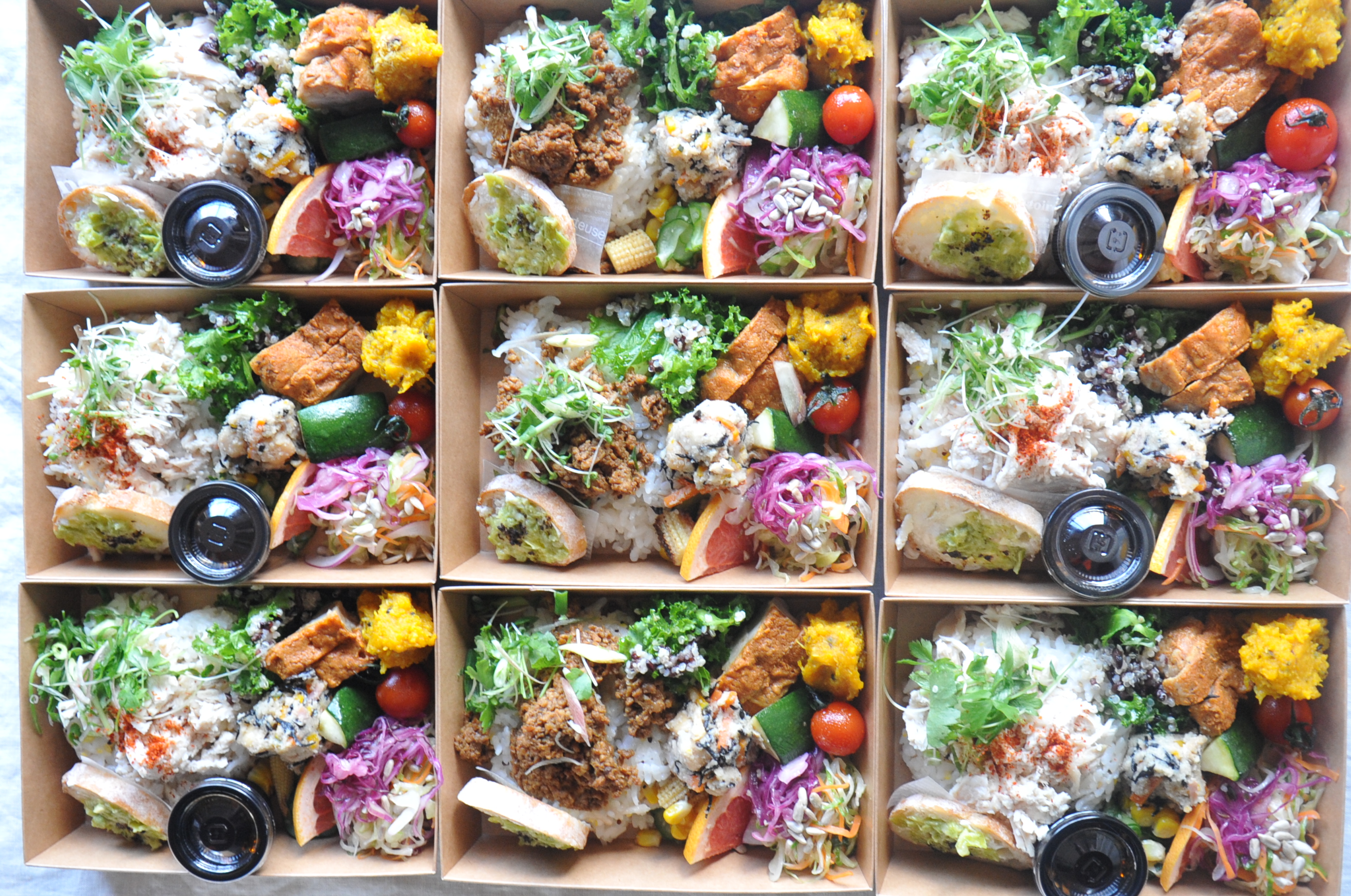 彩り野菜のコールスロー/アボカドサンド/エルヴィスサンド/エッグスラット/大豆のファラフェル/ブッダボウル ファラフェルを添えて/チキンブレスト ハラペーニョソース、ハリッサ、ハーブ塩を添えて/グルテンフリーのベリーの米粉コブラー