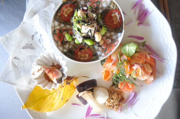 ひじきと雑穀の彩りマリネ/エッグココット いくらを添えて/菊花かぶ ゆずとブラックペッパー/牛肉の八幡巻き/山梨風雑煮/いちじくとナッツのテリーヌ/ロスコン・デ・レジェス