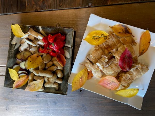 秋野菜の焼き浸し ゆずこしょうの香り/秋野菜のチーズ焼きピンチョス/きのこのマフィン・サレ