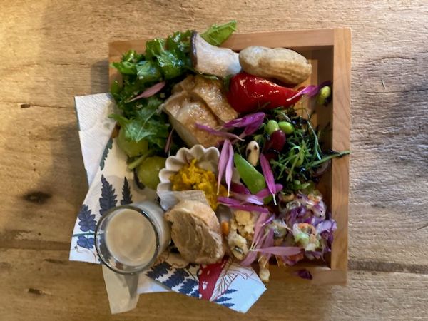 島豆腐とひじきのサラダ/クランベリーとブラックペッパーのチーズ/かぼちゃのすり流し/ゆず玉みそ 秋の吹き寄せ仕立て/大豆ミートの赤みそカザレッチャ/シュークルート 自家製粒マスタード添え/ひよこ豆の入った発酵ごはん/米ぬかの入ったオートミールクッキー2種/甘栗のマロンシャンティ