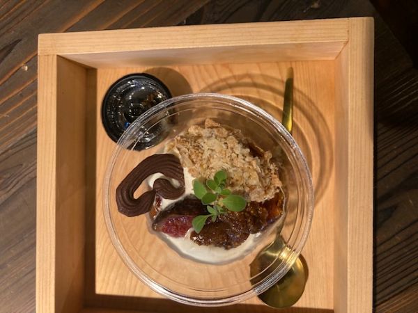 真鯛の昆布〆めをのせる秋の和えずし/新ごぼうとチョコレートのケーキ/小豆といちじくのミニパフェ