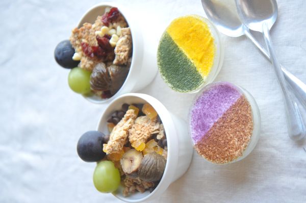 ししとうディップ/かぼちゃマサラ/ひじきとひよこ豆の卯の花/黒米とキヌアとケールのサラダ/小豆とフルーツマリネパフェ/シトラスゼリーのパフェ