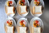 ほたてのマヨネーズ炒め/グラス仕立ての重ねずし/青汁と黒豆のケーキ/トマトとマンゴーのゼリー/ビスケットトリュフ