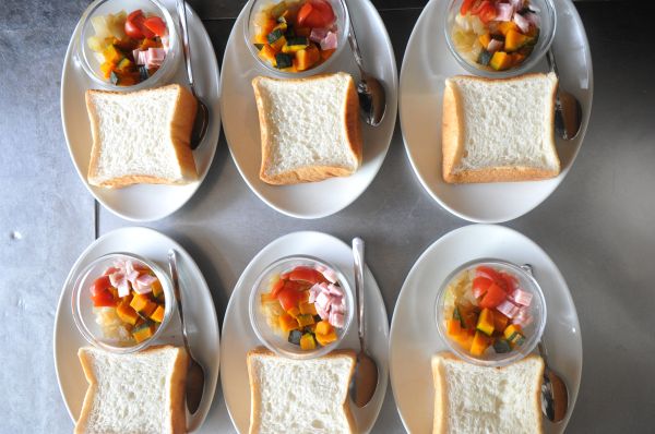 ミニトマトとオリーブのライスサラダ/トマトとマンゴーのスープ/キューカンバーサンドイッチ/生ハムと大葉野サンド八丁味噌の香り/夏野菜のブレゼ/プリンのようななめらかキッシュ/フルーツのみりんマリネ お手軽タルト風/マリネ ミニパフェ風/パンのみみラスク